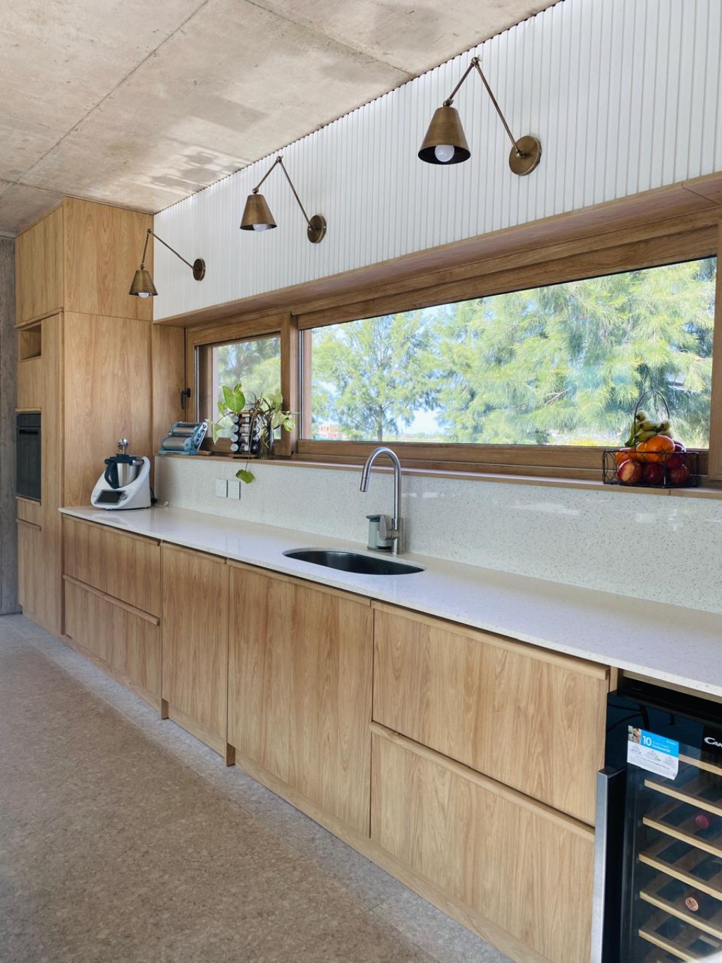 Los apliques tipo farol fueron ubicados sobre la mesada para aportar luz dirigida de trabajo, sin resignar clima ni identidad visual.